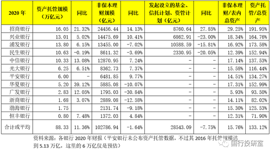 除传统表内业务外,以非保本理财和资产托管为代表的表外业务亦是股份行的亮点(实际上目前头部城商行亦在这两类业务上发力)。截至2020年底,12家股份行的资产托管和非保本理财余额合计分别达到88.83万亿和10.28万亿,占表内总资产的比例平均值分别达到15.76%和133.12%。