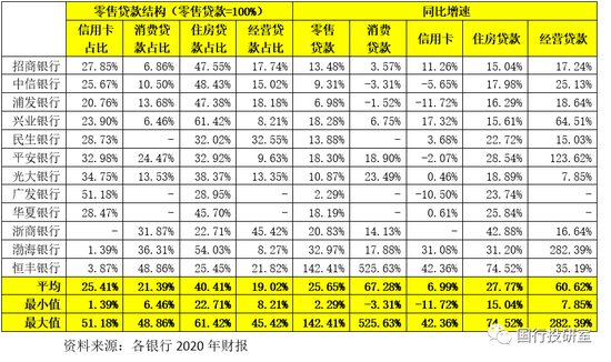 (3)对于情况比较特殊的恒丰银行来说,其2020年零售贷款增长较为迅猛(增速高达142.41%),其中消费贷款猛增525.63%、住房贷款增74.52%、信用卡增42.36%。