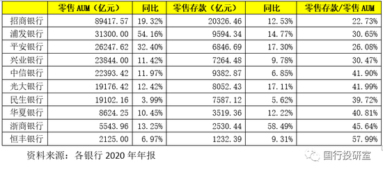 实际上除前面讨论的那些指标外,股份行的零售AUM(包括零售存款、零售理财、零售代销等)可能是最为分化的一类指标,这一指标能够体现出一家银行的零售综合金融服务能力,即对零售客户寻找可投资资产的能力。