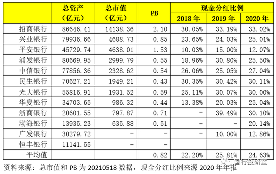 2、2018-2020年股份行的现金分红比例平均分别为22.20%、25.18%和24.63%。不过分红比例与其市值之间并没有对应关系,如分红比例最高的招行其市值亦比较高,而市值较高的平安银行其分红比例却仅有12.07%。