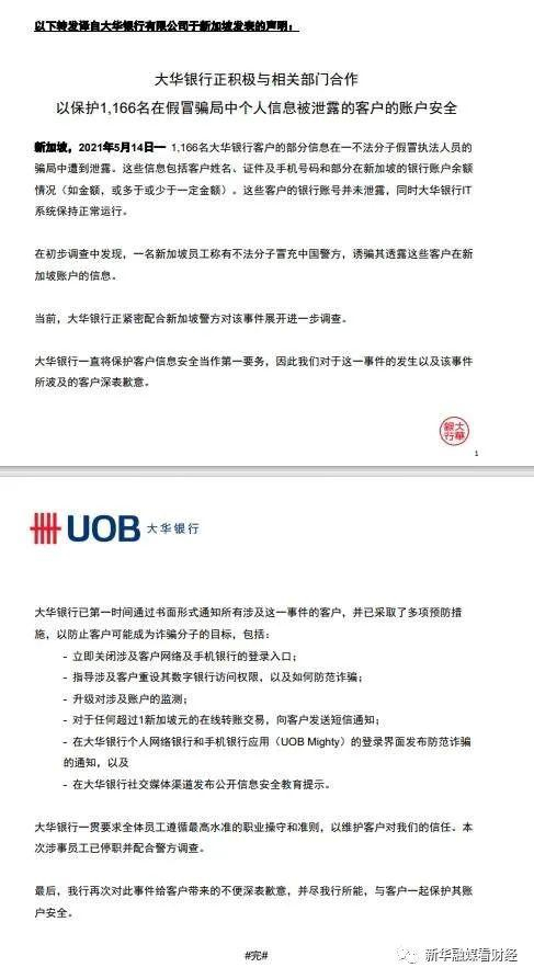据了解,同在5月,总部位于新加坡的大华银行有限公司(以下简称“大华银行”)陷入客户信息泄露事件。1166名中国籍客户的个人信息被泄露。