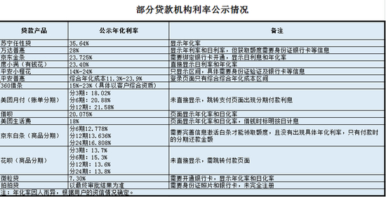 值得注意的是,部分网贷产品在官方渠道公示过年化利率,但在具体消费场景中,这些产品的年化利率又不约而同地“躲猫猫”。