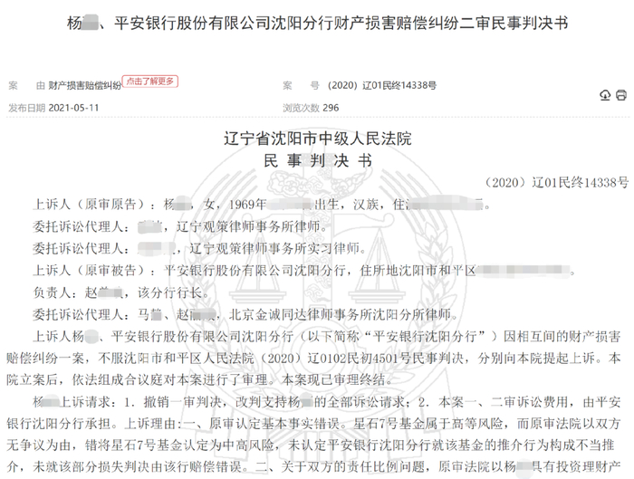法院判决,平安银行沈阳分行赔偿杨女士投入本金的利息损失的65%,并赔偿杨女士本金损失16.25万元及其自赎回日起至付清之日止的资金占用利息损失。