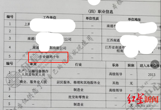 在其提供的个人征信报告中,红星资本局注意到,职业信息的“工作单位”一栏中出现了“专业做鸡十年”字样。房女士表示,目前,她正在委托律师起诉,“我希望他们书面公开道歉,并且给予一定的精神赔偿。”