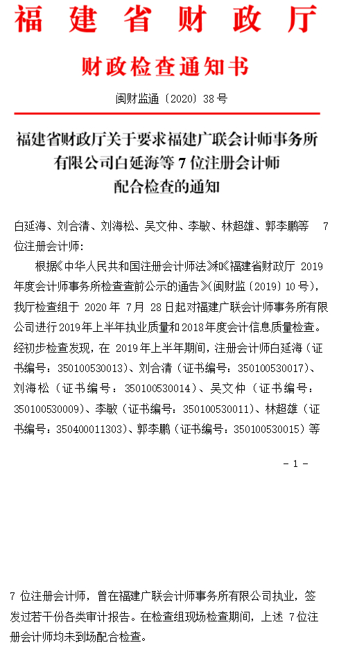 2020年11月,福建省财政厅曾公布过一份检查通知书,内容显示,7位注册会计师,曾在福建广联会计师事务所有限公司执业,签发过若干份各类审计报告。在检查组现场检查期间,这7位注册会计师均未到场配合检查。