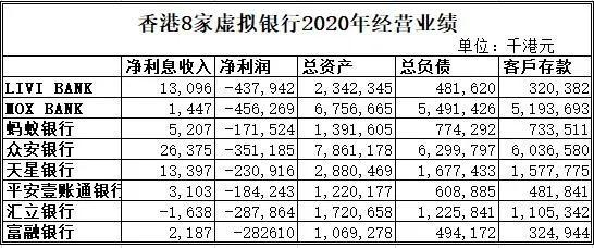 LIVI BANK、天星银行的总资产在20亿港元左右,其余4家虚拟银行均在10亿港元左右。