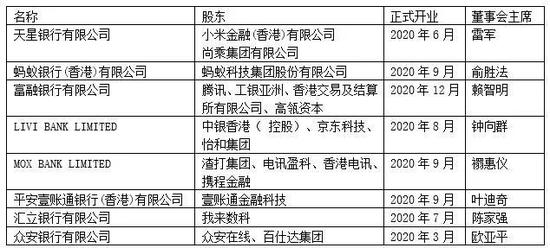 2019年上半年,香港金管局相继发出3批共8张虚拟银行牌照,分别为LIVI BANK LIMITED(下称“LIVI BANK”)、众安银行有限公司(下称“众安银行”)、MOX BANK LIMITED(下称“MOX BANK”)、汇立银行有限公司(下称“汇立银行”)、蚂蚁银行(香港)有限公司(下称“蚂蚁银行”)、平安壹账通银行(香港)有限公司(下称“平安壹账通银行”)、天星银行有限公司(下称“天星银行”)和富融银行有限公司(下称“富融银行”)。