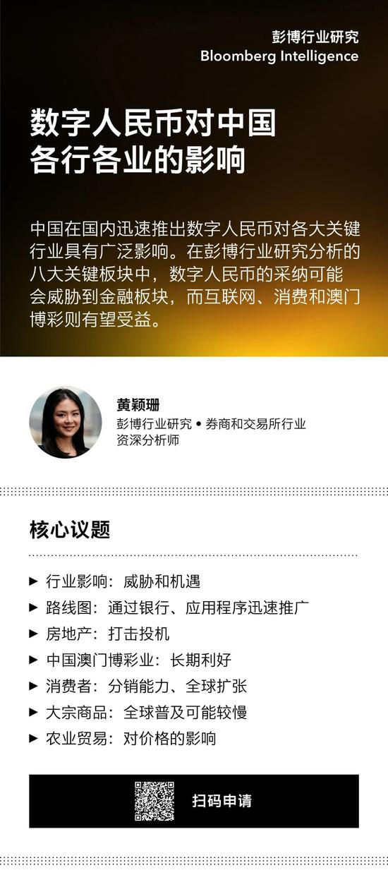 继2021年3月推出《中国2022:数字人民币应用新纪元》特别报告之后,彭博行业研究(Bloomberg Intelligence. BI)持续跟进数字人民币的发展,并推出《数字人民币对中国各行各业的影响》独家报告,聚焦市场八大行业版块,探讨数字人民币的应用对中国市场产生的广泛影响。扫描图片中的二维码,申请阅读完整报告!