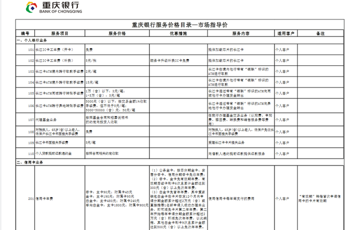 重庆银行服务价格目录