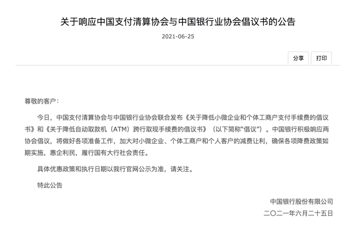 6月25日,中国银行官网发布《关于响应中国支付清算协会与中国银行业协会倡议书的公告》,该行表示,将积极响应两协会倡议,将做好各项准备工作,加大对小微企业、个体工商户和个人客户的减费让利,确保各项降费政策如期实施,惠企利民。