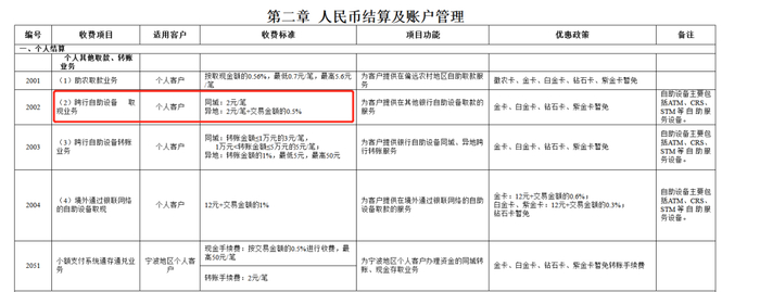 股份行方面,以浙商银行为例,该行跨行取现为2元/笔,异地跨行还要按交易金额的0.5%加收异地取现手续费,最低是1元/笔,最高是20元/笔。地方银行方面,以北京银行为例,异地及同城跨行取现均为2元/笔;重庆农商行异地同城跨行取现手续费也相同,境内均为4元/笔。