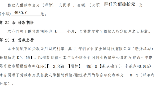 合同显示,这笔借款的本金为5685元,年化利率为7.8%,但由于深圳首付宝进行贴息每期0.45%,因此黄德并不需要付利息,仅还5685元的本金即可。