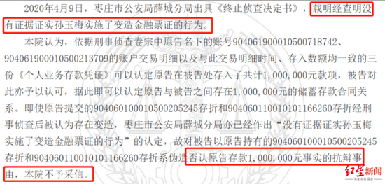 然而,就在2020年4月9日,枣庄市公安局薛城分局出具的《终止侦查决定书》显示,经查明,没有证据证实孙女士实施了变造金融票证的行为。