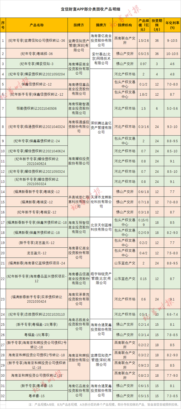 相同情况还有“龙吉盈元-12”、“粤卓睿-15”、“粤福盈-15”、“保鑫信债权转让-12”、“保鑫芳债权转让-18”、“海南亚和辉投资公司债权转让-18”及2号产品,和“耀佳债权转让”等类固收产品系列。证券时报记者统计,这10个产品系列一共被拆分成了21个子产品,规模共计不超过11.25亿元。