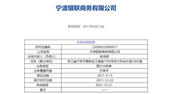 天眼查显示,宁波银商成立于于2006年1月,法人为有中信证券背景的陈岳辉,公司经营范围包括银行卡收单;银行卡专业化服务;计算机软硬件的开发、设计、制作、销售自产产品等。宁波银商持有的支付牌照将于2021年12月21日到期。