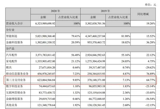 支付业务撑起了海联金汇金融科技板块营收的半壁江山。财报数据显示,2020年,海联金汇金融科技板块实现营业收入13.02亿元,较上年同期上涨36.28%,实现归属于上市公司股东的净利润7526.57万元,较上年同期上涨118.54%。其中,第三方支付作为公司金融科技板块重点发展的核心业务之一,2020年实现营业收入6.23亿元,较2019年同期增长64.77%。