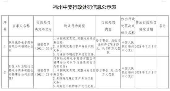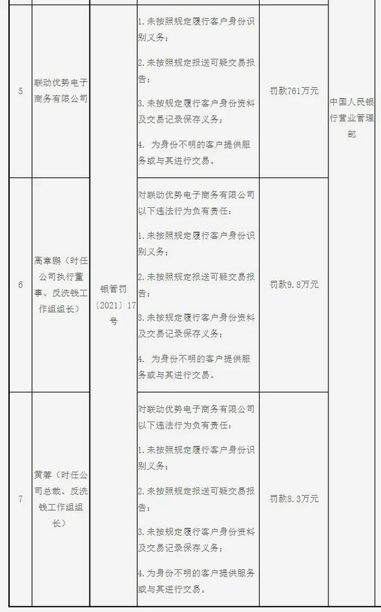 其中,记者注意到联动优势已是年内第2次被罚。今年3月,联动优势因3项违规被央行给予警告,并合计罚没约385万元。时隔4个月联动优势收到更大额度罚单761万元。从处罚事由来看,联动优势2次被罚均与“未按规定履行客户身份识别义务、与身份不明的客户交易”等违反反洗钱规定行为有关。