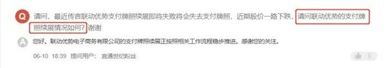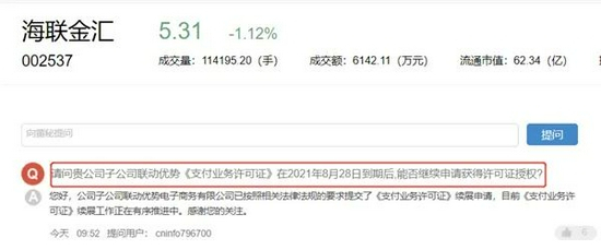 联动优势的上述合规隐忧引起了投资者的关注。记者在投资者互动平台上看到,今年6月份,有投资者向海联金汇提问称,最近传言联动优势支付牌照续展即将失败将会失去支付牌照,且近期海联金汇股价一路下跌,特咨询联动优势的支付牌照续展情况如何。对此,海联金汇回答表示,“联动优势电子商务有限公司的支付牌照续展正按照相关工作流程稳步推进。”