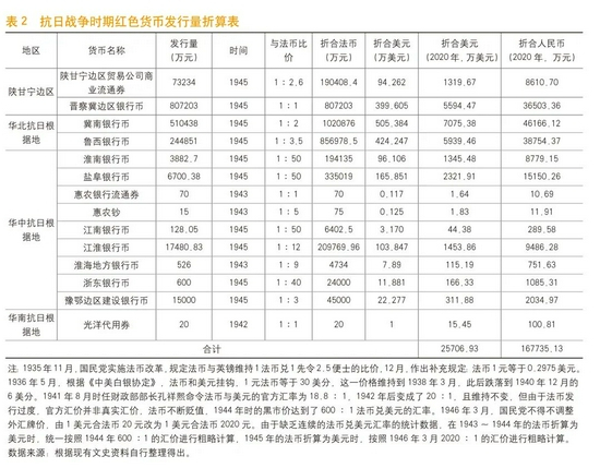 抗日战争时期,红色货币为信用货币,不与美元发生直接兑换,可利用法币兑美元的汇价进行换算。与大革命时期和土地革命时期的折算方法类似,分为四个步骤:一是利用货币与法币之间的比价关系,将货币发行量换算成法币;二是根据法币兑美元比价换算成美元;三是采用货币发行年份到2020年的美国CPI指数进行折算,得到货币发行量的2020年美元现值;四是按照2020年12月31日银行间外汇市场人民币汇率中间价:1美元兑人民币6.5249元,换算为人民币现值(见表2)。