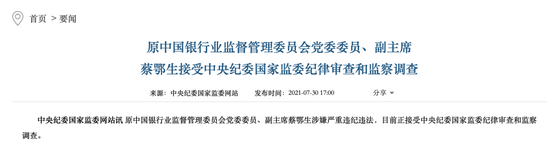 两个多小时之后,ZJW在17时发布了一则公告:原CBRC副主席蔡鄂生涉嫌严重违纪违法,目前正接受纪律审查和监察调查。