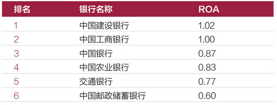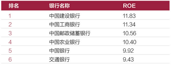 从总资产收益率ROA来看,建设银行和工商银行均超过了1%,建设银行为1.02%排在第一位,邮储银行最低为0.6%排在第六位。从净资产收益率ROE来看,“传统四大行”均超过了10%,建设银行为11.83%排在第一位,工商银行为11.34%排在第二位,中国银行和交通银行的ROE均未超过10%,交通银行为9.43%排在最后一位。