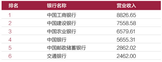表5:2020年大型商业银行营业收入排行榜(单位:亿元)