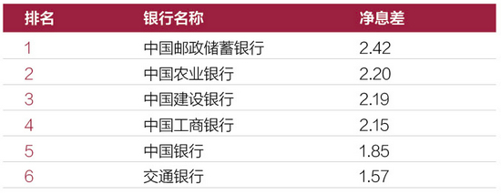 从净息差来看,6家大型商业银行也存在一定差距,其中,邮储银行2020年净息差达到2.42%排在第一位,农业银行、建设银行和工商银行净息差也均超过了2%,中国银行和交通银行未达到2%,分别为1.85%、1.57%排在第五、第六位。