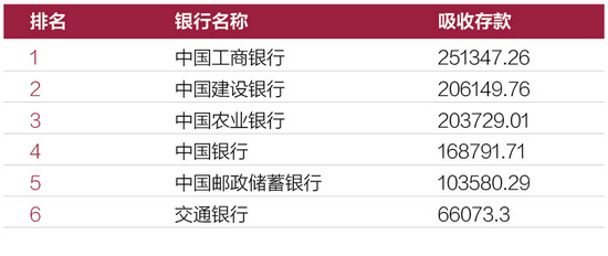 表3:2020年大型商业银行吸收存款排行榜(单位:亿元)