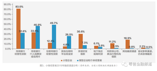 “2019年,83%的小型企业使用过传统银行经营性贷款,33.8%使用过传统银行消费贷,12.3%使用了互联网银行经营性贷款;在微型企业和个体经营者中,近一半使用过互联网银行经营性贷款(49.7%),和传统银行个人消费贷或信用卡(46.9%)进行融资,仅有32.6%使用过传统银行经营性贷款。”