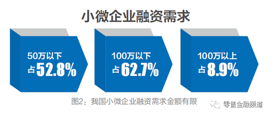 根据2018年中国人民银行的数据统计,我国商业银行发放的单户500万以下的普惠口径小微贷款余额仅占全部企业贷款的2%。在小微企业里,约有52.8%的融资需求金额在50万以下,62.7%的融资需求金额在100万以下,仅有不到8.9%金额超过100万,所以相对于大客户的贷款需求,小微企业的确是“开胃小菜”。