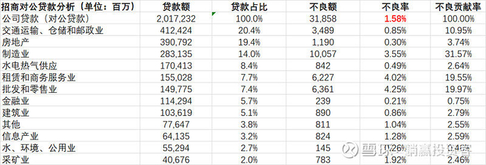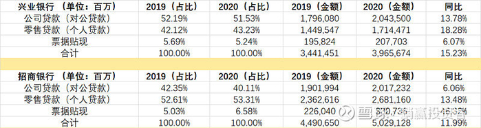 对公贷款最重要的一个数据:对公贷款不良率,招商银行在财报里明确写明是1.58%,而兴业银行没有明确给出这一数据,只能根据财报中的信息推断。根据上表中兴业对公贷款信息的整理(根据财报第30页的表格整理而来),对公贷款不良额为326.44亿,不良率为1.60%。而兴业银行2020年底不良贷款总额为496.56亿,个人贷款不良额为178.3亿(17144.71亿*1.04% = 178.3亿,第30页),票据贴现不良额为0.21亿。这样算下来,对公贷款不良额大约为318.05亿,不良率约1.56%(对公贷款总额20435亿)。326.44亿,318.05亿,数据的差异可能是由四舍五入引起的,毕竟财报30页表格没有给出具体的不良额,计算有出入是正常的。不管怎样,兴业银行对公贷款不良率在1.56% ~ 1.60%之间,跟招商银行的1.58%接近。在对公贷款领域,两家银行基本打个平手。