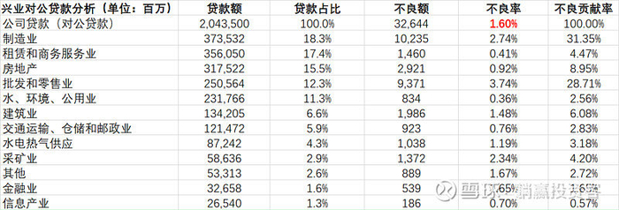 兴业银行对公贷款20435亿,招商银行20172亿,规模几乎一样。从上表中可以看出,招商前5的投放行业是:交通运输、仓储和邮政业、房地产、制造业,水电热气供应、租赁和商务服务业,这几项占对公贷款的比例达到70%。兴业前5投放行业是:制造业、租赁和商务服务业、房地产、批发和零售业、水环境公用业,这五项占对公贷款比例为74%,放贷领域都十分地集中,两者的共有项是房地产和制造业。看来制造业和房地产确是国民经济的两根支柱