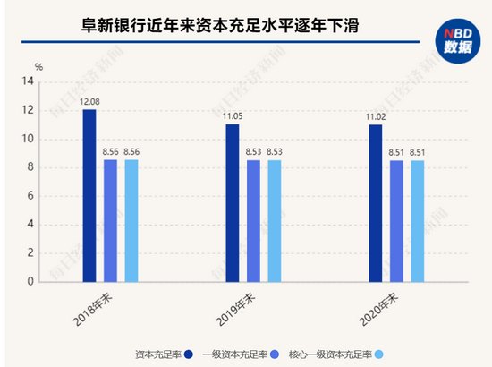 记者查询阜新银行年报发现,该行资本充足率近三年逐年下滑,2018年至2020年,阜新银行资本充足率为12.08%、11.05%、11.02%,核心一级资本充足率分别为8.56%、8.53 %、8.51% 。
