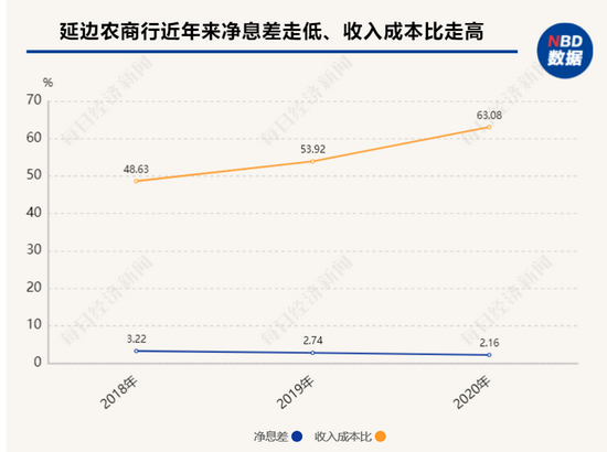 此外,近年来延边农商盈利能力也一路直下。2017年至2020年,该行净利润分别为12亿元、9.74亿元、7.48 亿元、4.3亿元,净息差由2018年的3.22%降至2020年的2.16%。此外,成本收入比也逐年攀升,2018年至2020年,该行这一指标分别为48.63%、 53.92 %、63.08 %。