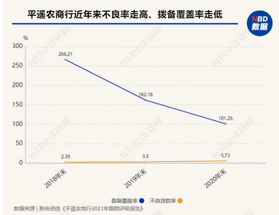 记者发现,平遥农商行拨备覆盖率也呈连续下滑趋势,2018年至2020年,这一指标分别为266.21%、162.18%、101.26%。与此同时,该行不良率也连续攀升,2018年至2020年分别为2.39%、3.5%、5.73%。联合资信在报告中指出,平遥农商银行面临较大资本补充压力,这些因素对其经营发展及信用水平可能带来不利影响。