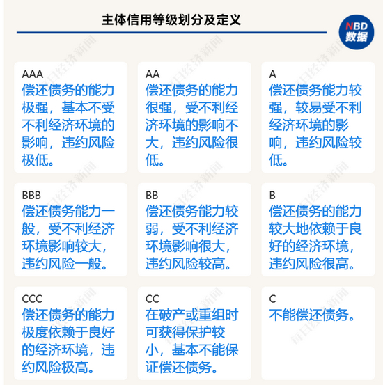 宋歌告诉记者:“不同信用等级主要代表评级机构对受评主体偿还债务能力的相对强弱、偿还债务能力受经济环境的影响程度,以及其违约风险的相对高低等方面的判断。”不同信用级别所代表的含义如下表所示: