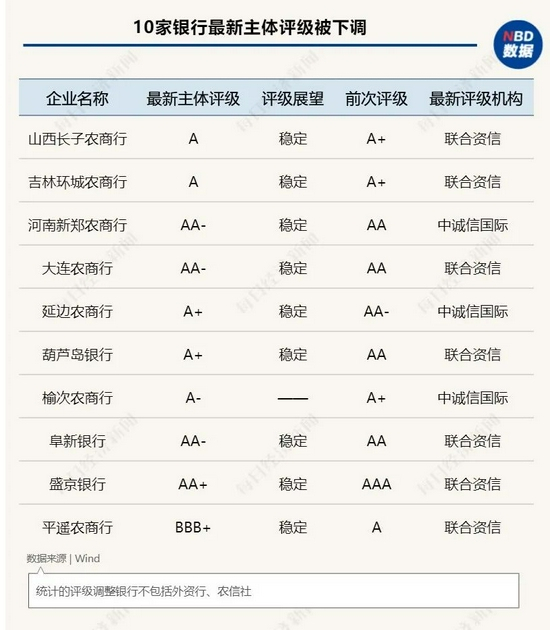 Wind数据显示,从今年年初至8月5日,已有10家银行主体评级被下调,包括盛京银行、阜新银行、葫芦岛银行、延边农商行、大连农商行、吉林环城农商行、山西长子农商行、山西榆次农商行、山西平遥农商行、河南新郑农商行。