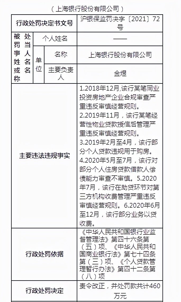 7月12日,上海银保监局公布的一张行政处罚信息公开表显示,上海银行2018年至2020年存在6项业务违规被责令改正并处罚款共计460万元。其中多项涉及贷款管理问题,而涉及到信贷资金违规流入房市的具体包括:2019年2月至4月,该行部分个人贷款违规用于购房。此外,该行还在其他信贷授信业务方面存在多项违法违规事由。