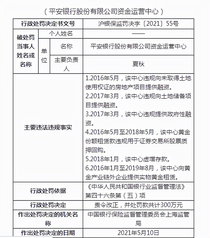 此外,5月14日,平安银行资金运营中心收到的一张沪银保监罚决字〔2021〕55号处罚信息公开表显示,2016年,该中心因违规向未取得土地使用权证的房地产项目提供融资等6项违法违规事实被上海监管局责令改正并处罚款300万元。