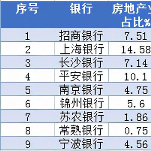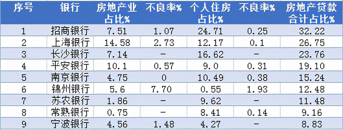 近期恰逢上市银行的半年度报告披露季,其各自的房地产贷款问题也自然成为人们关注的重点。据记者统计,截至8月22日,9家上市银行披露的半年报中,招商银行房地产贷款占比合计为32.22%,个人住房贷款占比为24.71%,而监管部门对其的个人住房贷款占比和房地产贷款占比上限分别为20%和27.5%,照此要求,招行个人住房贷款占比和总房地产贷款占比均超警戒线。此外,记者发现,9家上市银行中,宁波银行房地产贷款合计占比最低为8.83%,锦州银行房地产业贷款不良率最高,为7.70%。