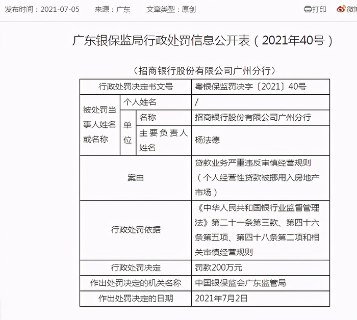 7月5日,据广东银保监局行政处罚信息公开表(2021年40号)显示,招商银行广州分行因贷款业务严重违反审慎经营规则(个人经营性贷款被挪用入房地产市场)被处罚款200万元。