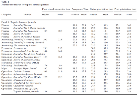 那么,一篇文章在金融学或商学期刊上被接收需要多长时间?在线发表和最终出版需要多长时间?