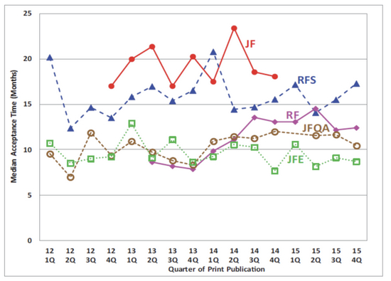JF的在线和印刷出版时间的中位数和平均数从34.5个月到36.9个月不等,这比其他四家期刊要慢得多。