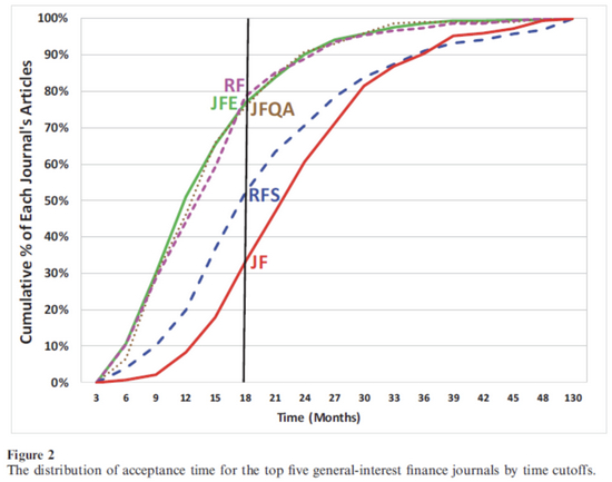 首先,作者从期刊的网站手动收集了JF、JFQA、JFE、RF、RFS等5本顶级金融期刊在2012-2015年出版的所有文章的发表进度信息。