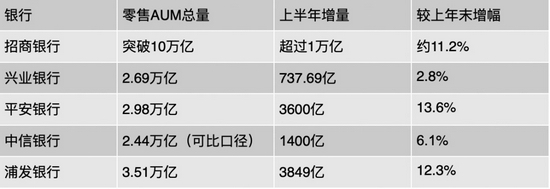 从几家股份行的半年报来看,招行的零售AUM规模和新增都在股份行中一骑绝尘,总量突破10万亿、半年新增超过1万亿的表现甚至超过了部分国有大行。