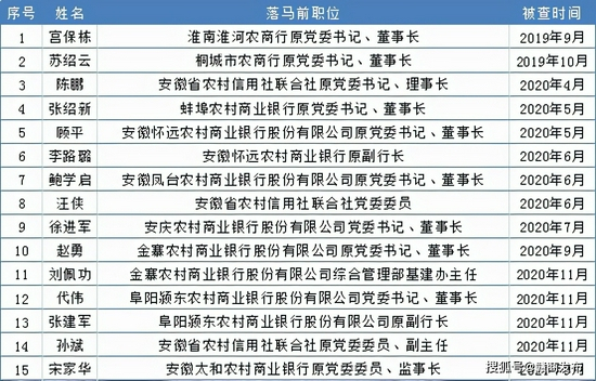 据统计,继去年4月2日安徽省农村信用社联合社原党委书记、理事长陈鹏接受审查调查后,安徽农信系统多名干部落马,目前人数已扩大至15人。其中包括省联社原高管3人,以及凤台、安庆、金寨等多地农商行高管。