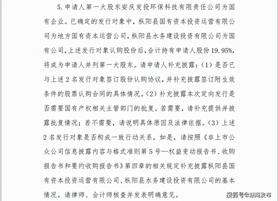 监管层也关注到发行对象为国资企业的情况。证监会在对上述2家农商行的反馈意见中,均提及此次定向发行涉及的必要的国资审批程序问题。证监会指出,枞阳农商行的发行对象认购股份后,合计持股19.95%,将成为申请人并列第一大股东,并要求该行补充说明“上述2名发行对象是否构成一致行动关系”等问题。