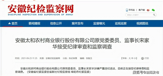 进入2021年,这场反腐风暴仍在持续。9月23日,据安徽省纪检监察官网消息,安徽太和农村商业银行原党委委员、监事长宋家华涉嫌严重违纪违法,目前正在接受纪律审查和监察调查。