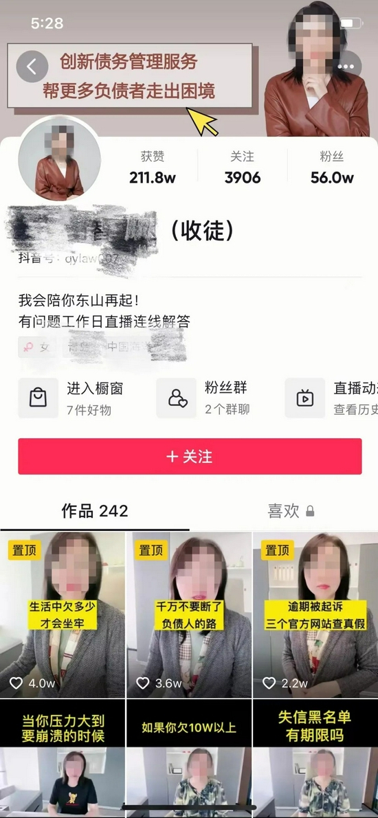 还有在整个反催收产业链中不可忽略的传播环节——各个短视频平台,一些金融业人士建议,能否对于教唆逃废债、鼓励反催收等内容进行限制,对于一些自称律师的账号进行身份验证等,也是有效阻断反催收获客的方式。