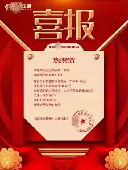 一些代理投诉或委托协商的成功案例被律所或中介反复宣传,甚至做成「喜报」大肆传播。减免金额被放在了核心的位置,可以轻易地刺激到借款人的神经,人性的黑洞被瞬间放大,「违约」似乎并不是一件可耻的事。